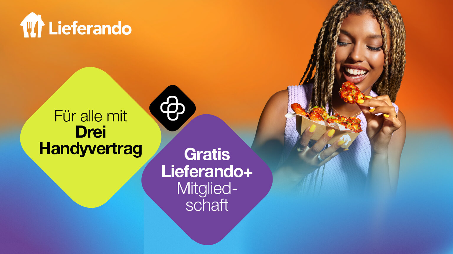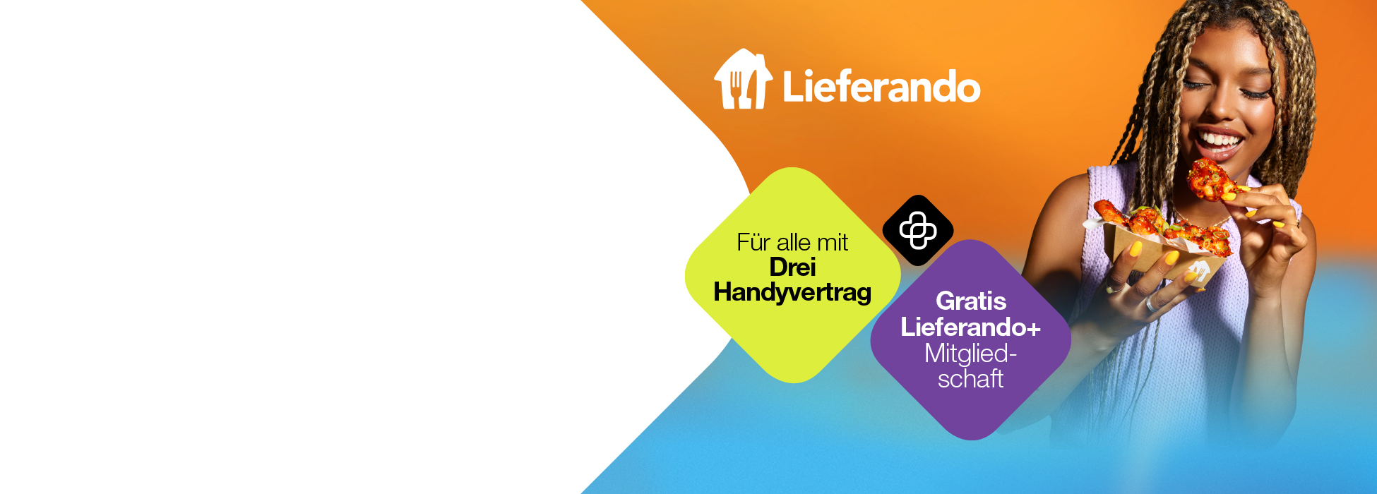 Bye bye, Lieferkosten! Lieferando+ ist das Upgrade für alle Food- & Convenience Lover: Spar dir mit deiner Drei Handynummer sämtliche Lieferkosten für 90 Tage – bei tausenden Restaurants und Geschäften, bei jeder Bestellung ab einem Mindestbestellwert von 15 €. Und zwar ganz ohne automatische Verlängerung!