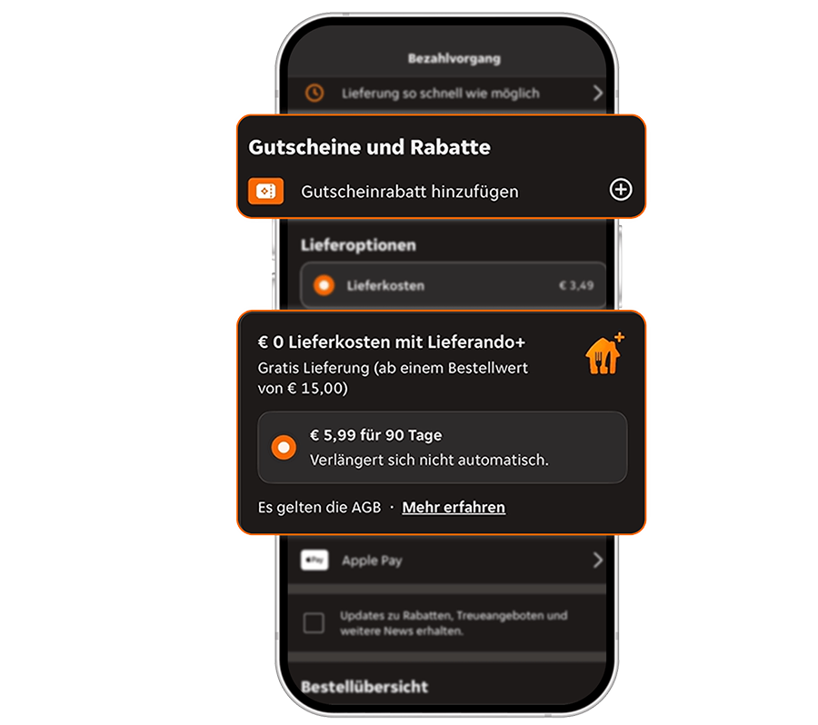 - Füge Lieferando+ beim Bezahlvorgang hinzu (erscheint nur, falls Lieferkosten anfallen würden).