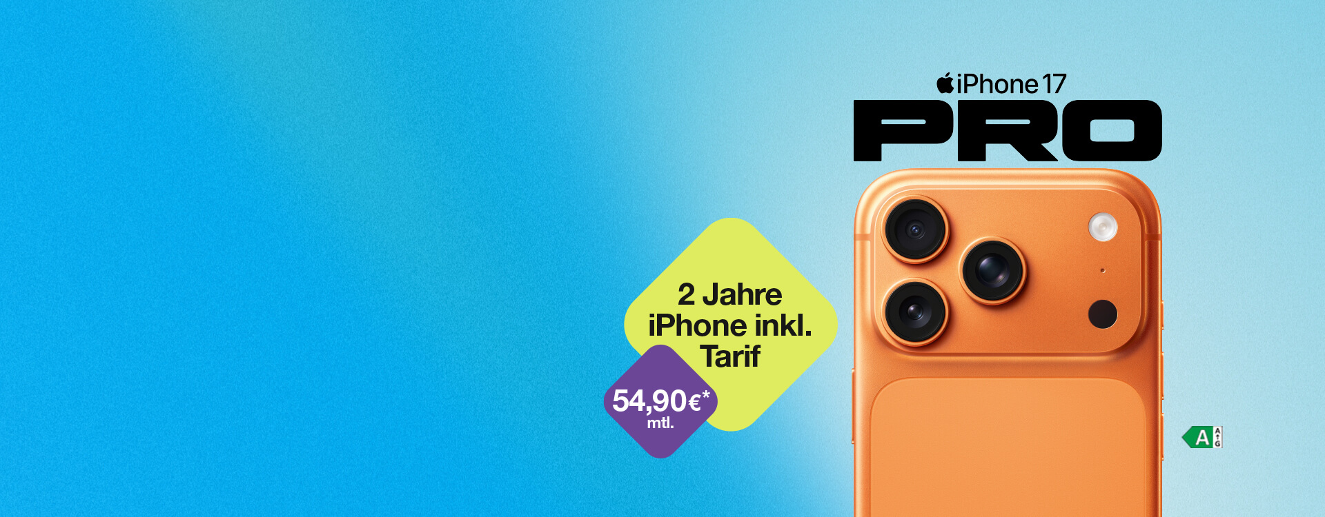 Das neue iPhone 17 Pro mit 0 €* Anzahlung in unserer Handyfreiheit um 54,90 € pro Monat.