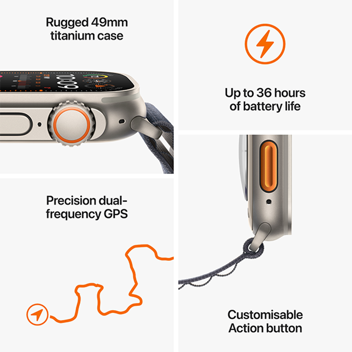 • EXTREM ROBUST, UNGLAUBLICH LEISTUNGSFÄHIG – Korrosionsbeständiges 49 mm Titangehäuse. Große Digital Crown und anpassbarer Action Button für die direkte Steuerung einer Vielzahl von Funktionen. 100 m Wasserschutz.⁵